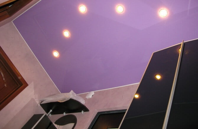Подсветка натяжного потолка может обычно выполняется с помощью классического решения — установки подвесных люстр. Однако, очень большой популярностью также пользуется решение по установке нескольких точечных светильников, встроенных в натяжное полотно. В зависимости от цвета потолка, его конструкции и вида поверхности (глянцевое или матовое) расположение осветительных лампочек может иметь множество вариантов, каждый из которых подходит для определенного сочетания элементов интерьера.