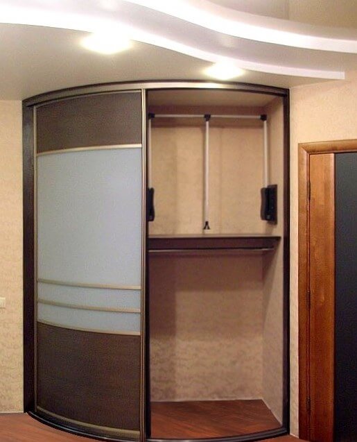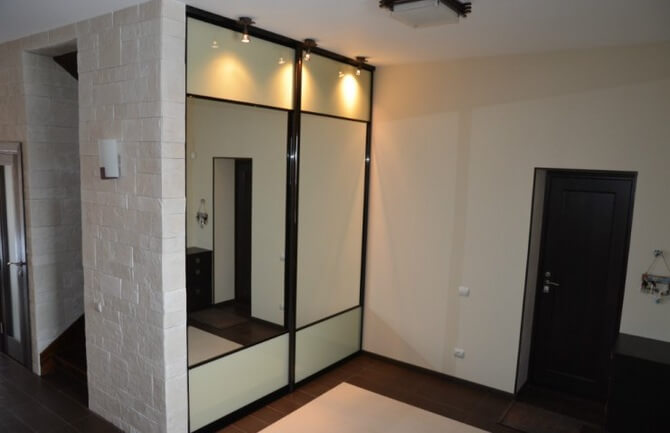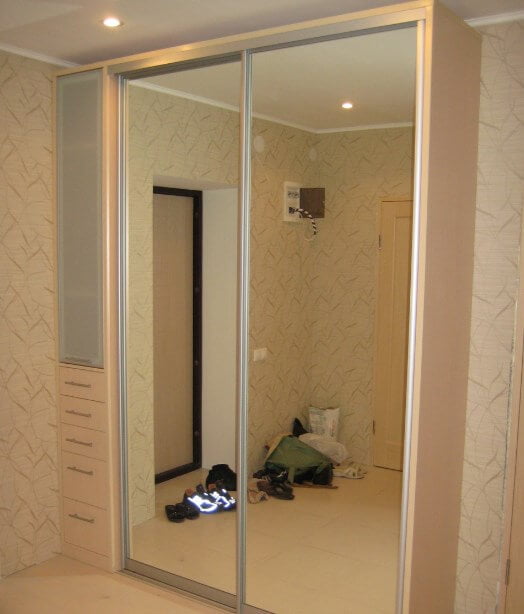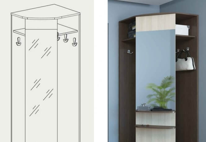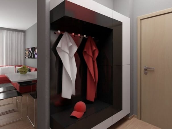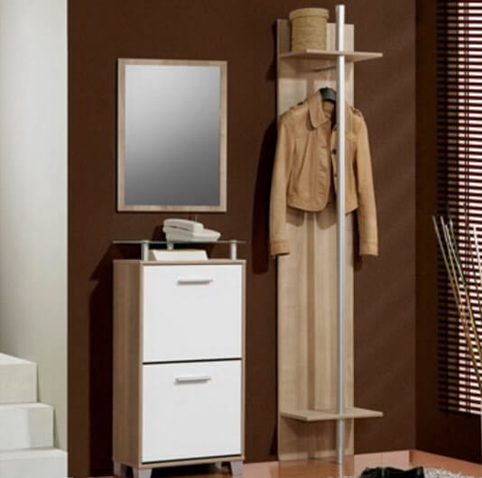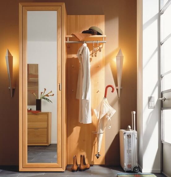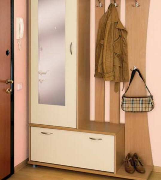 Мебель, в зависимости от пространства прихожей может составлять только шкаф-купе, глубиной не более 0,45 м, без задней стенки и с зеркальной дверцей. Такое решение оптимально, если места совсем в обрез. Низ занимает обувь, на верхней перекладине во фронтальном расположении, вешалки.