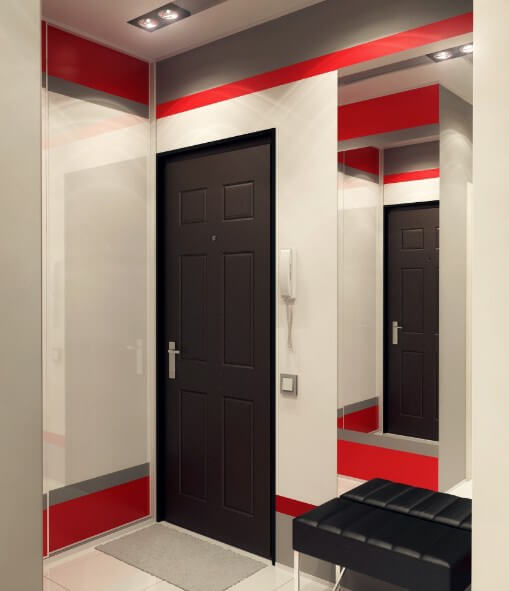 При достаточном освещении, следуя современным тенденциям, прихожую можно оформить в стиле хай-тек. При этом если стена коридора и смежной комнаты не является несущей, ее можно убрать и вмонтировать двусторонний шкаф.