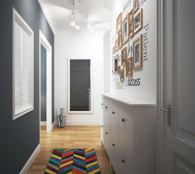 Не стоит делать коридор полностью под «больничный». Светлые тона все равно нужно разбавлять маленьким ярким акцентом. Подходящее решение — яркий коврик или нестандартная отделка стен.