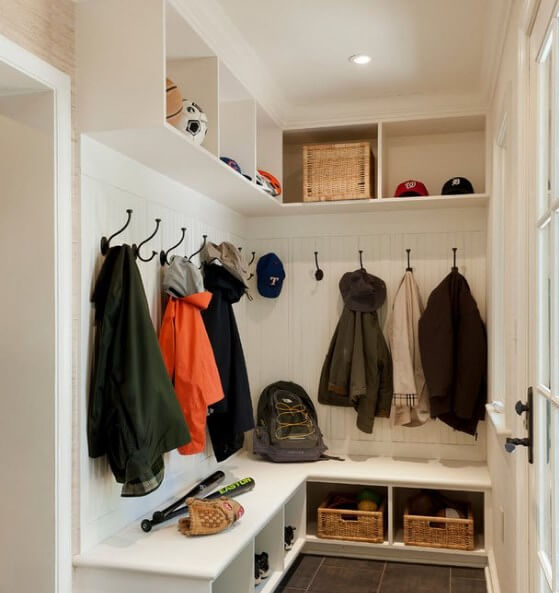 Угловые коридоры дают возможность с пользой использовать как раз тот самый «ненужный» угол. В него по всей высоте встраивается угловой шкаф или тумба с вешалкой и все вопросы размещения верхней одежды, обуви и аксессуаров разрешены. При этом такой интерьер не мешает свободному проходу в комнаты. Но от хранения всего набора верхней одежды придется отказаться, только необходимое по сезону.