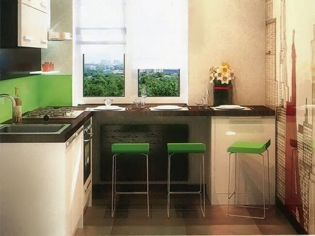 Оригинально выглядит барная стойка, объединенная с кухонным подоконником. Это позволяет экономить пространство, увеличивает полезную площадь рабочей поверхности, а также создает возможность любоваться видом из окна во время завтрака.