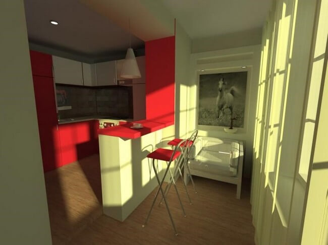 Если на кухне есть утепленная лоджия, существует возможность объединить ее с комнатой, а из перегородки сделать барную столешницу, объединив ее с кухонным комплектом.