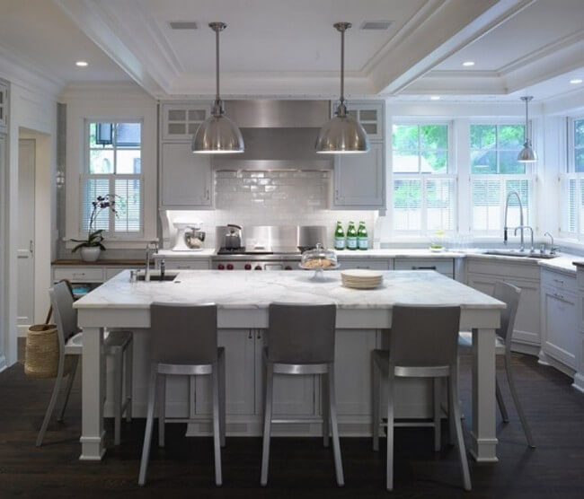 Барная стойка с островным расположением подходит, в основном, для владельцев большой кухни. Она может выполнять единственную функцию — обеденного стола, а может являться многофункциональной: одна сторона служит зоной для приготовления пищи, а вторая — для принятия пищи.
