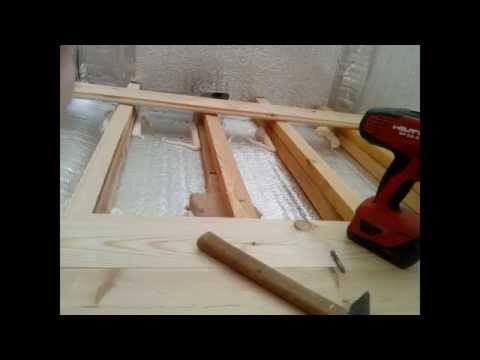 Для утепления пола можно использовать керамзит, с толщиной слоя приблизительно 10 см. Или пенопласт. В данном случае используется утеплитель пеноплекс. Вдоль балкона слетятся деревянные брусья и укладывается слой пеноплекса.