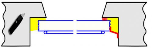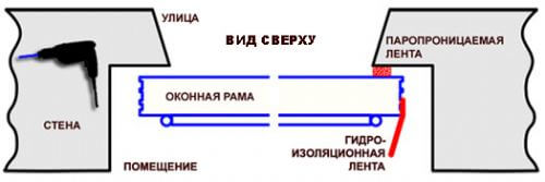 - изнутри наклеить по периметру окна (с боковых сторон и верхней части) гидроизоляционную самоклеящуюся ленту, обладающую паронепроницаемостью и используемую специально для пластиковых окон. Снизу приклеивается фольгированная полоса, которая впоследствии будет находиться под подоконной доской;