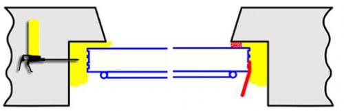 - заполнить (желательно, за сутки до монтажа) теплоизолирующей пеной внутреннюю полость подставочного профиля. Этот процесс, не упомянутый в ГОСТе и частенько не выполняемый строителями, производится для препятствования возникновению мостика холода в месте, где крепится профиль к раме.