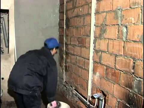 Когда все будет готово, можно приступать непосредственно к штукатурным работам. Раствор набрасывается на стену и разравнивается при помощи длинного правила, которое с обеих сторон опирается на направляющие-маяки.
