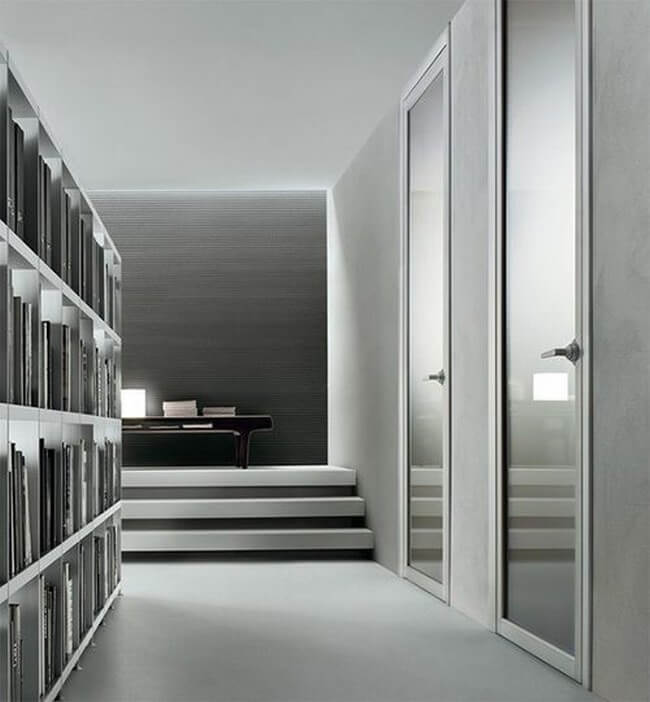 Двери в стиле хай-тек сочетаются с однотонными поверхностями и светлыми оттенками.